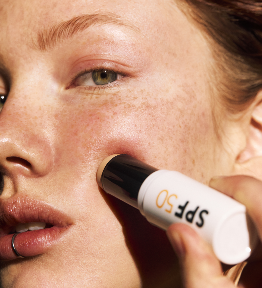 Reach for a sunscreen stick such as Mineral SPF50 Sunscreen Stick for on-top-of-makeup touch-ups. Tap the product into the skin — pressing sets the protection without moving foundation or blush.